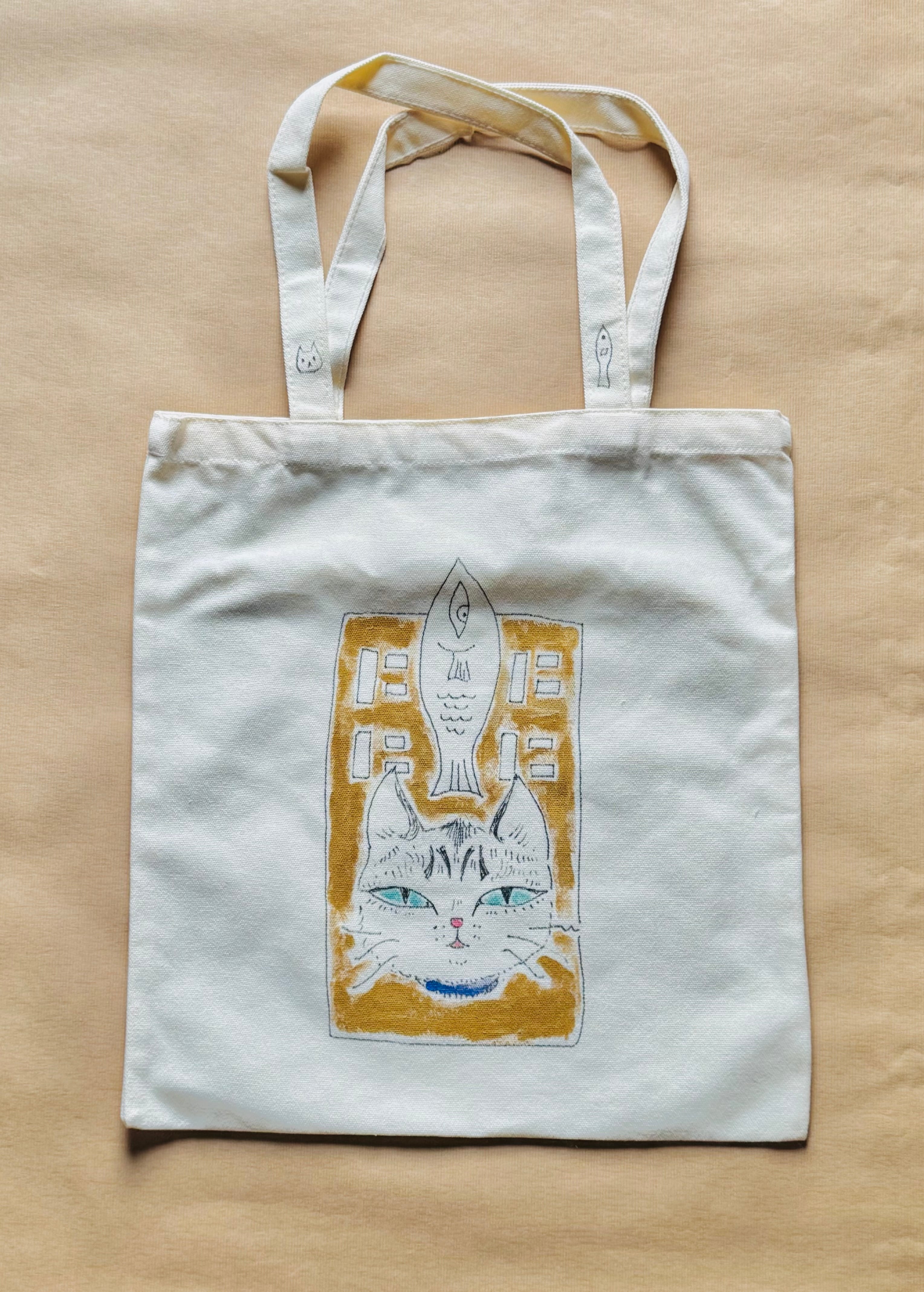 手描きイラストが描かれたマチ無しトートバッグ(B4がすっぽり入るサイズ)です。紐が長めなので肩掛けにしても◎お出かけやお散歩のおともにぴったり!(かもしれない)